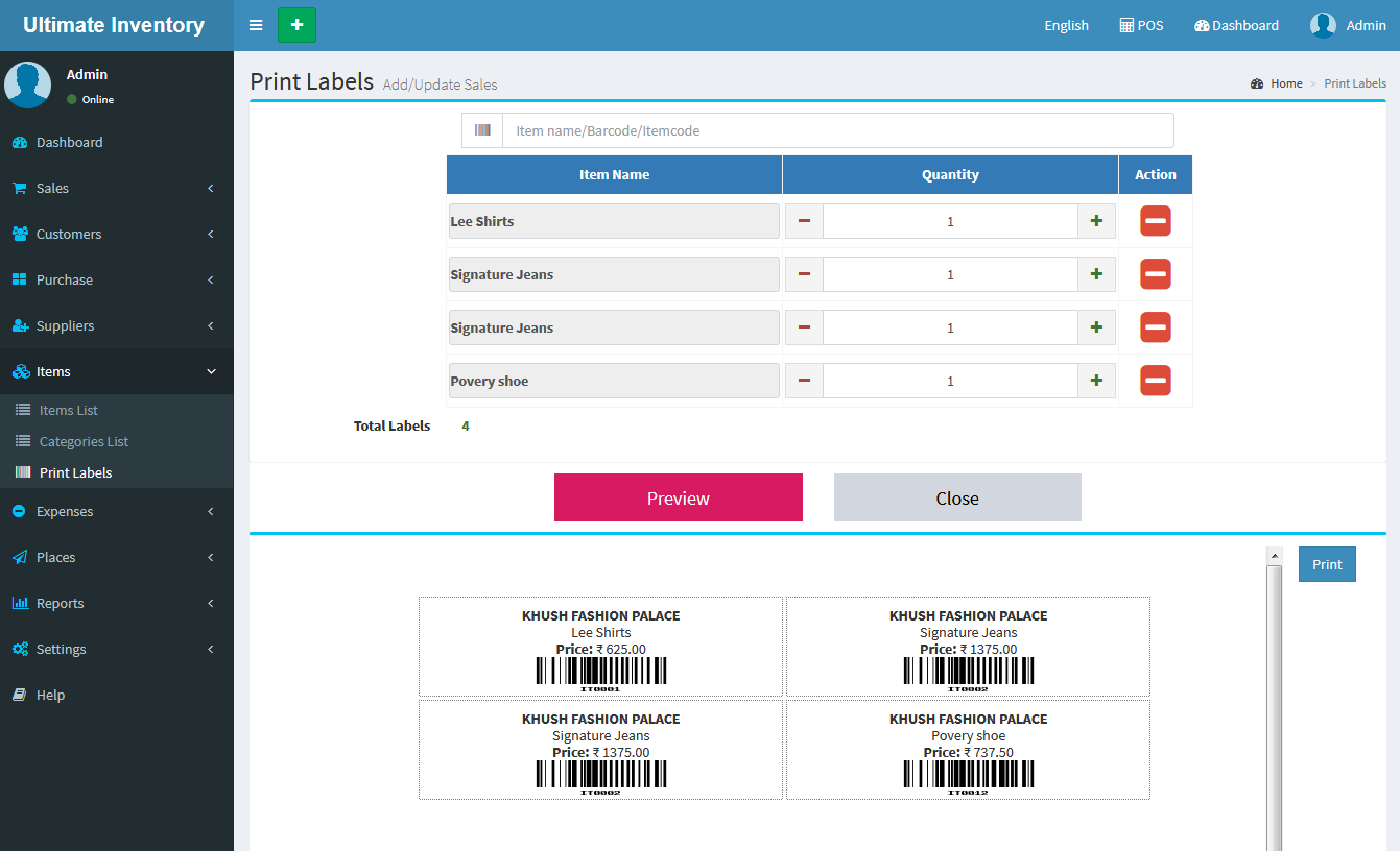 Select Items From Search Box and Select Number of quantities of Labels and Click on Preview Button and take prints.