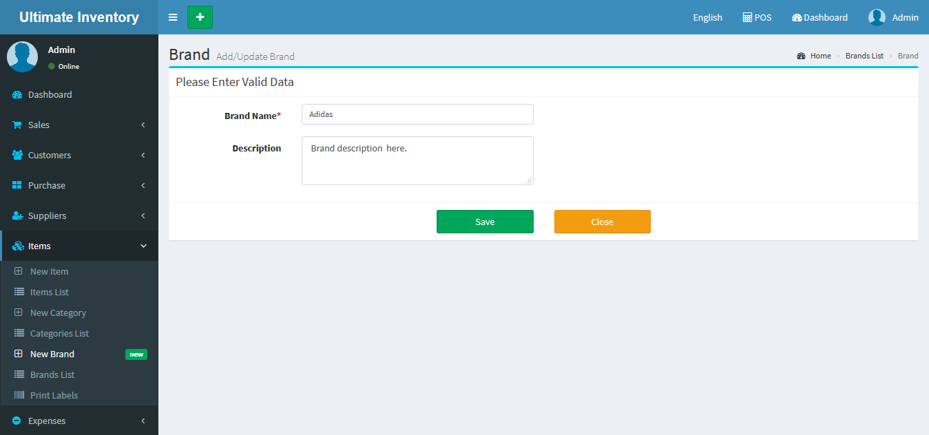 Adding a Brands it's a very easy task. Enter Brand name, description(Optional field) and click on Save button.