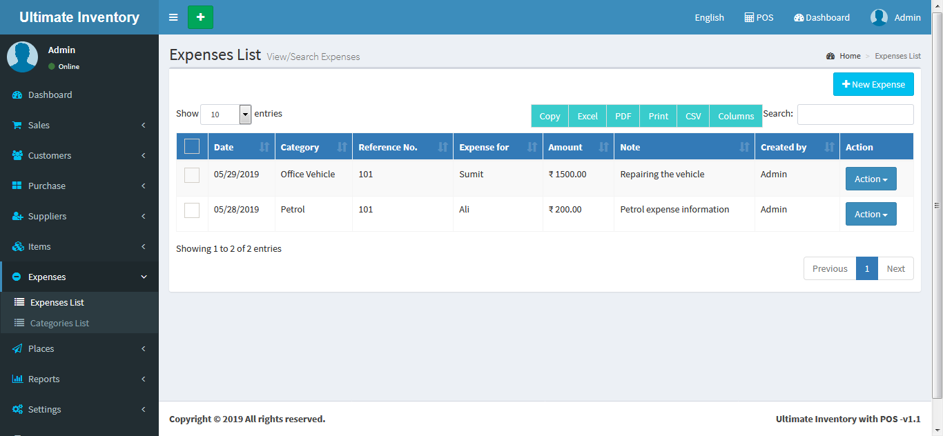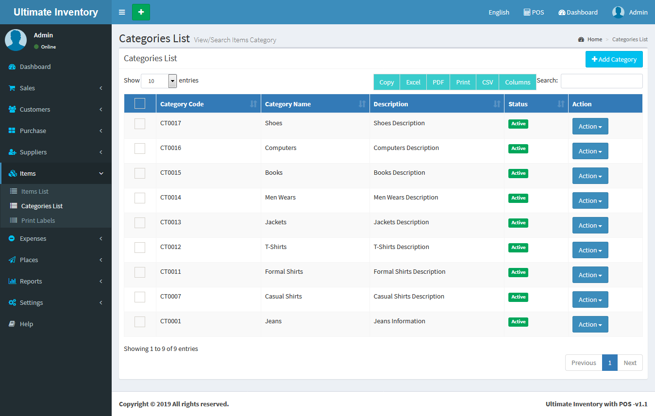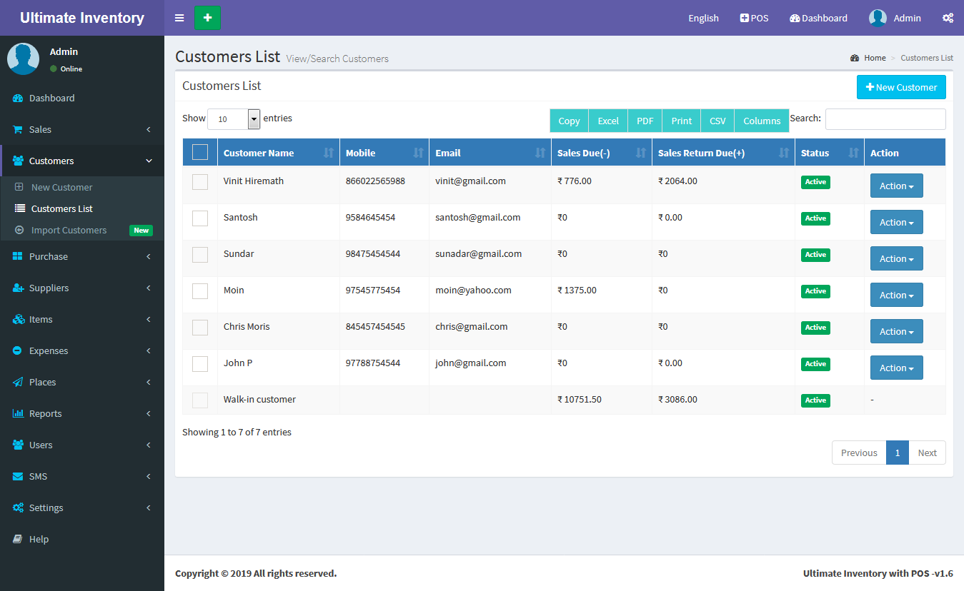 Inventory with POS is a web application software user can track Items & Stock Items, Manage Suppliers, Manage Customers, Items Categories, Sales, Purchase, Manage users and get all the reports which are require to your office and many more features.