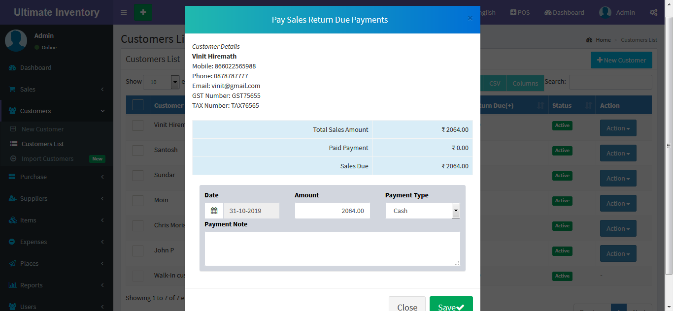 Adding a Customers it's a very easy task. Enter Customer name, Mobile, Phone, Email, GST Number, TAX Number,