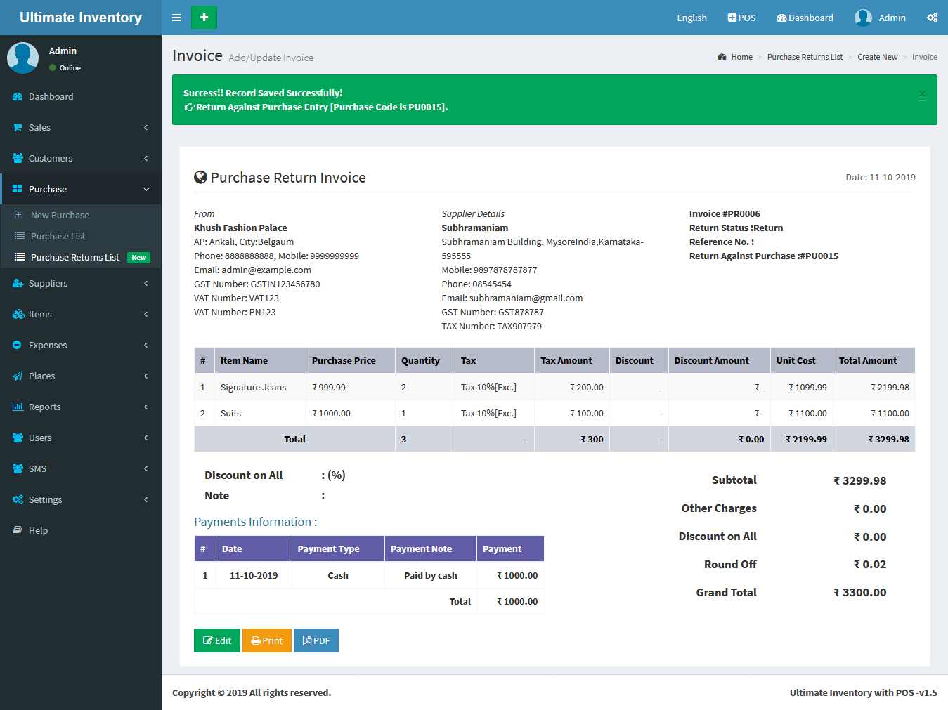 You can view the all the added Purchases Returns list and you can Purchases Return list by Delete & Edit actions.